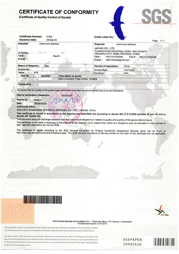 Jiayao es un fabricante especializado en el diseño, fabricación y suministro de torres de acero para proyectos de telecomunicaciones y transmisión eléctrica. Desde enero de 2010 operamos bajo el sistema de gestión de calidad ISO9001, lo que garantiza procesos de producción consistentes y productos confiables. A lo largo de los años, hemos participado en una amplia variedad de proyectos en entornos urbanos, suburbanos y zonas remotas, adaptando nuestras estructuras de torre a diferentes condiciones técnicas, ambientales y de instalación. Nuestro objetivo es ofrecer torres de acero para telecomunicaciones y transmisión que respondan a las necesidades reales de cada proyecto, proporcionando soluciones seguras, duraderas y de alto rendimiento a largo plazo.